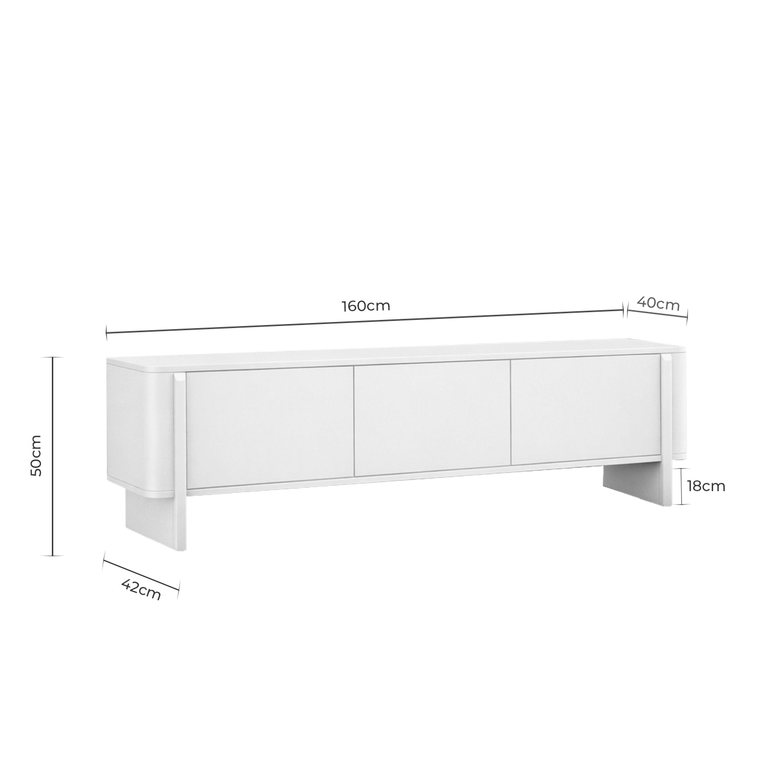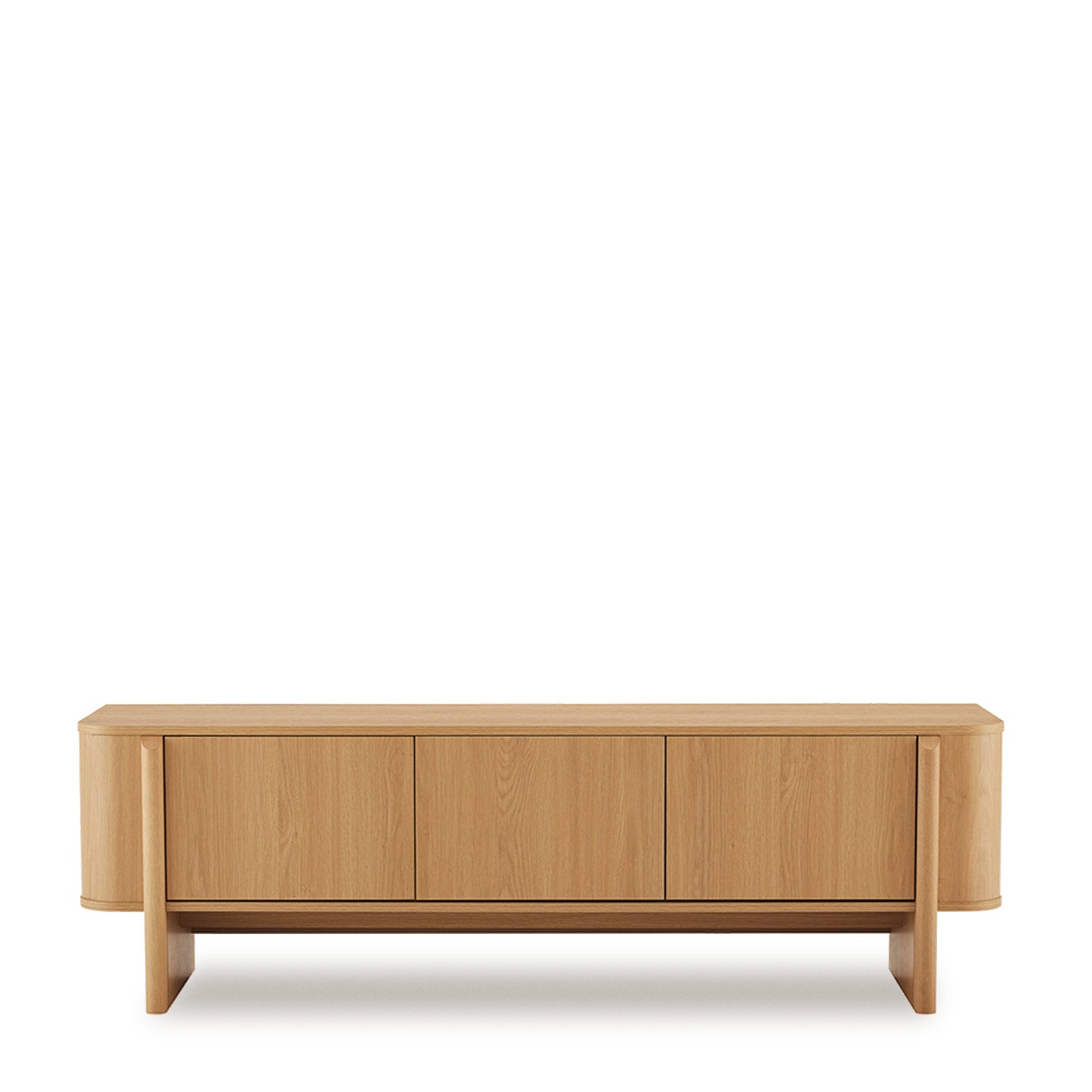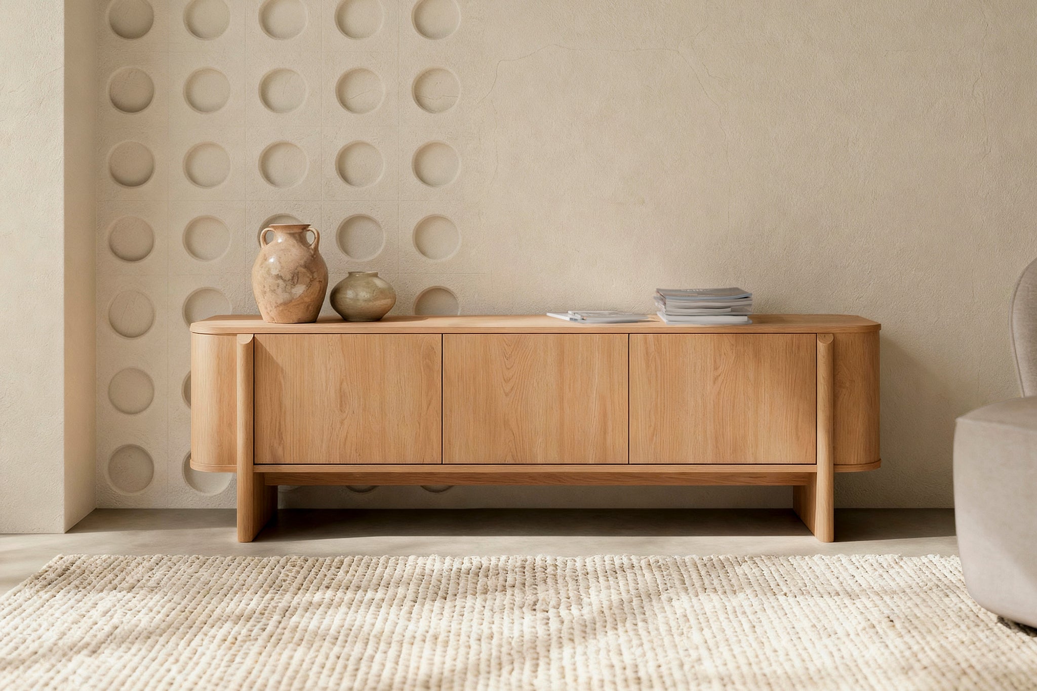 Este móvel TV de 160 cm destaca-se pelo design baixo e alongado, ideal para salas de estar modernas e nórdicas. Fabricado em melamina com efeito madeira, oferece um acabamento natural e luminoso que acrescenta conforto visual ao espaço.