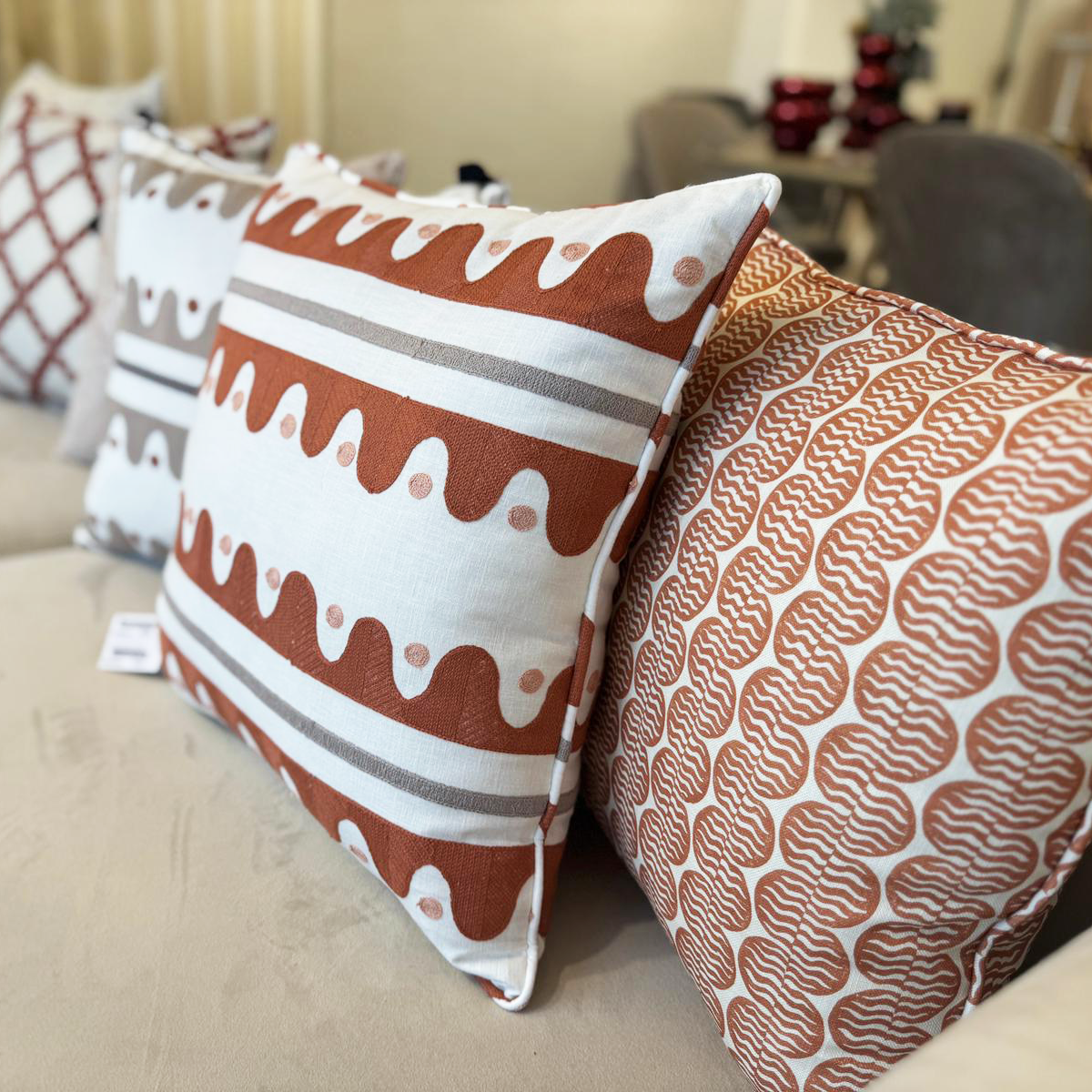Almofada decorativa com padrão geométrico-orgânico, onde formas estruturadas se misturam a linhas fluidas para um visual moderno e natural. Ideal para adicionar personalidade e equilíbrio entre elegância e descontração na decoração.