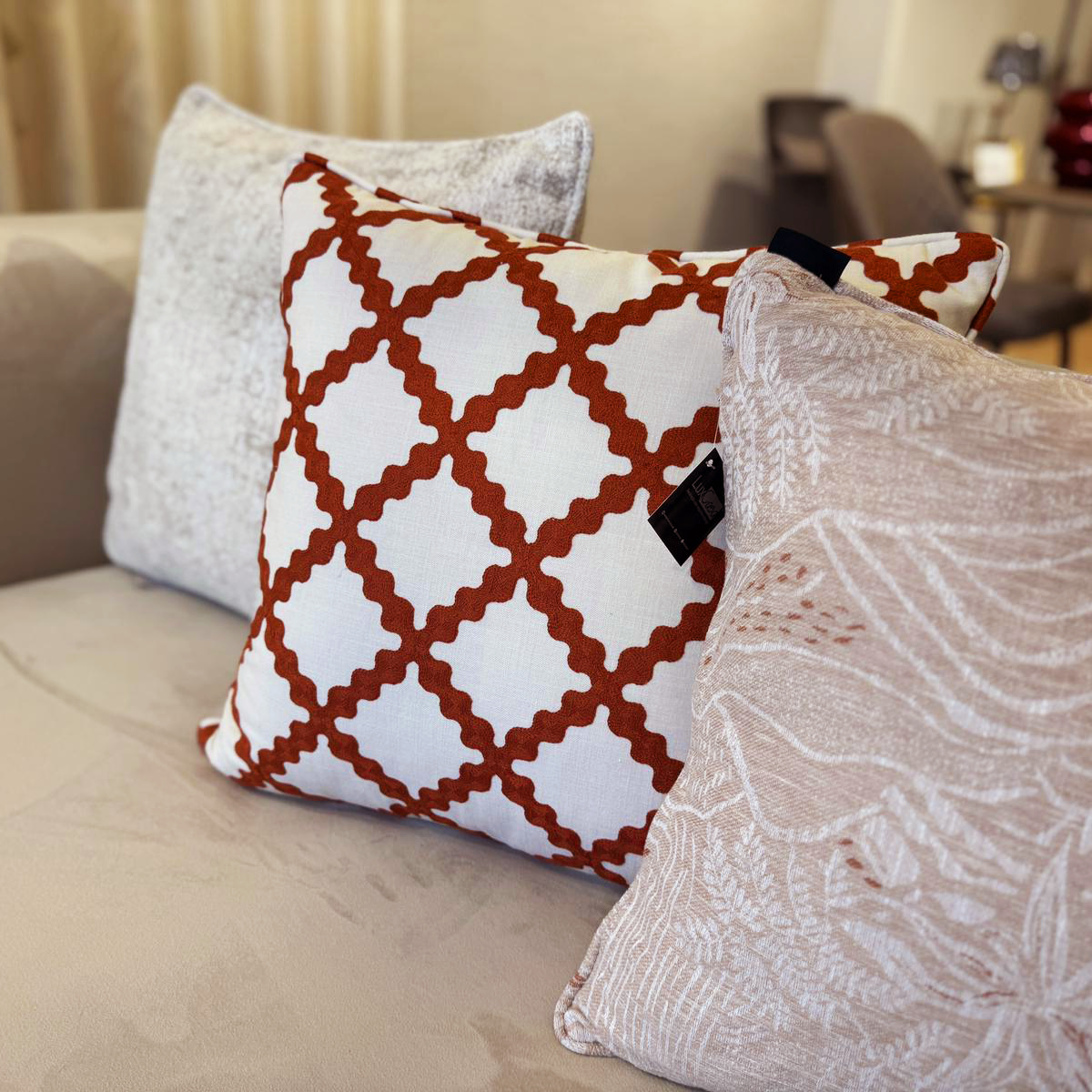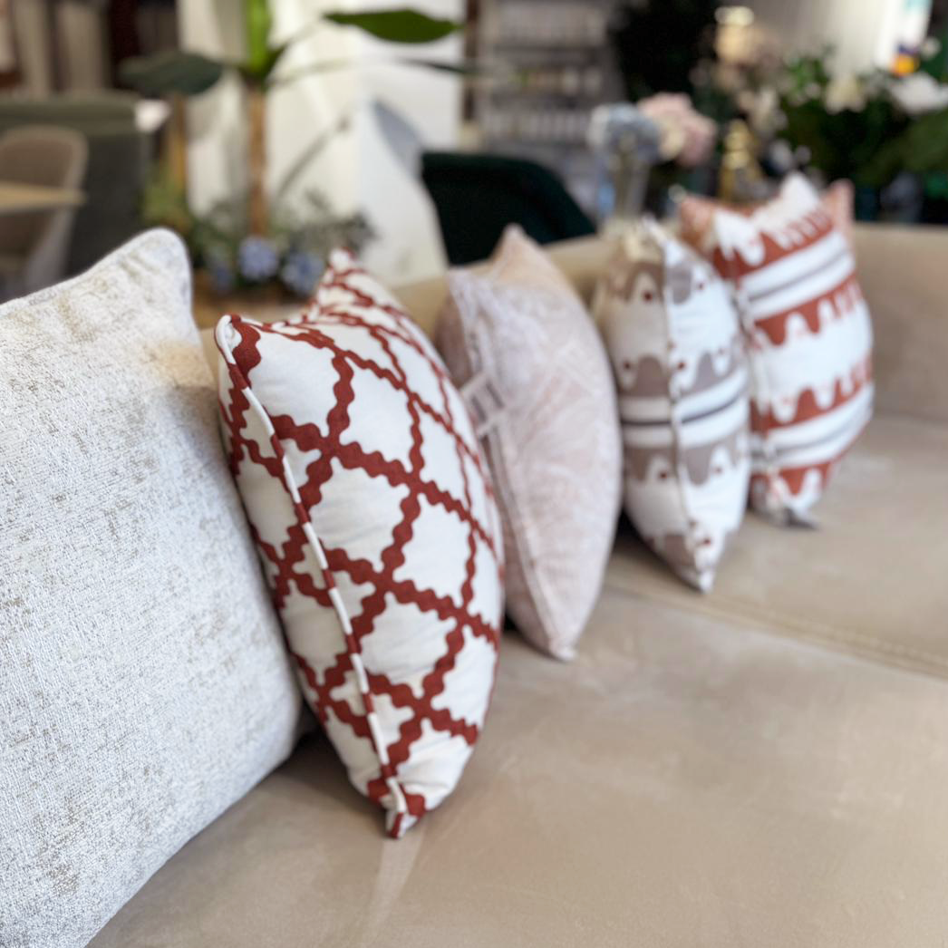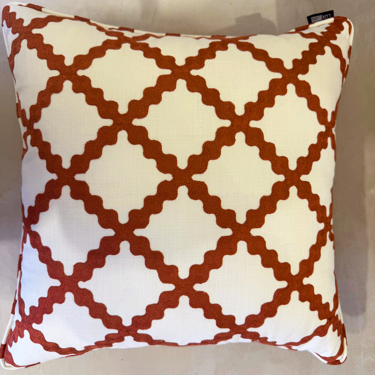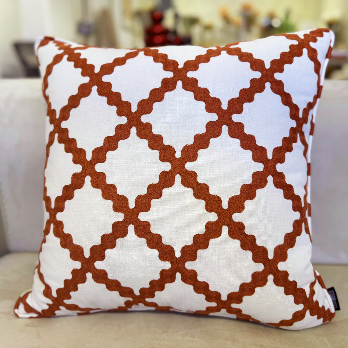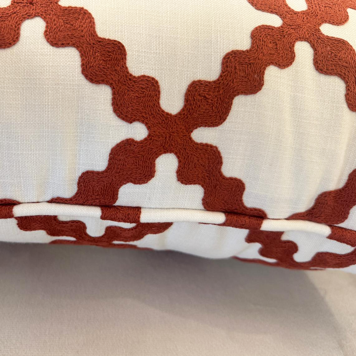 Almofada decorativa com bordado vermelho em losangos orgânicos, que adiciona cor, textura e charme a qualquer ambiente. Feita com acabamento artesanal e materiais de qualidade, é o toque perfeito de estilo e conforto.