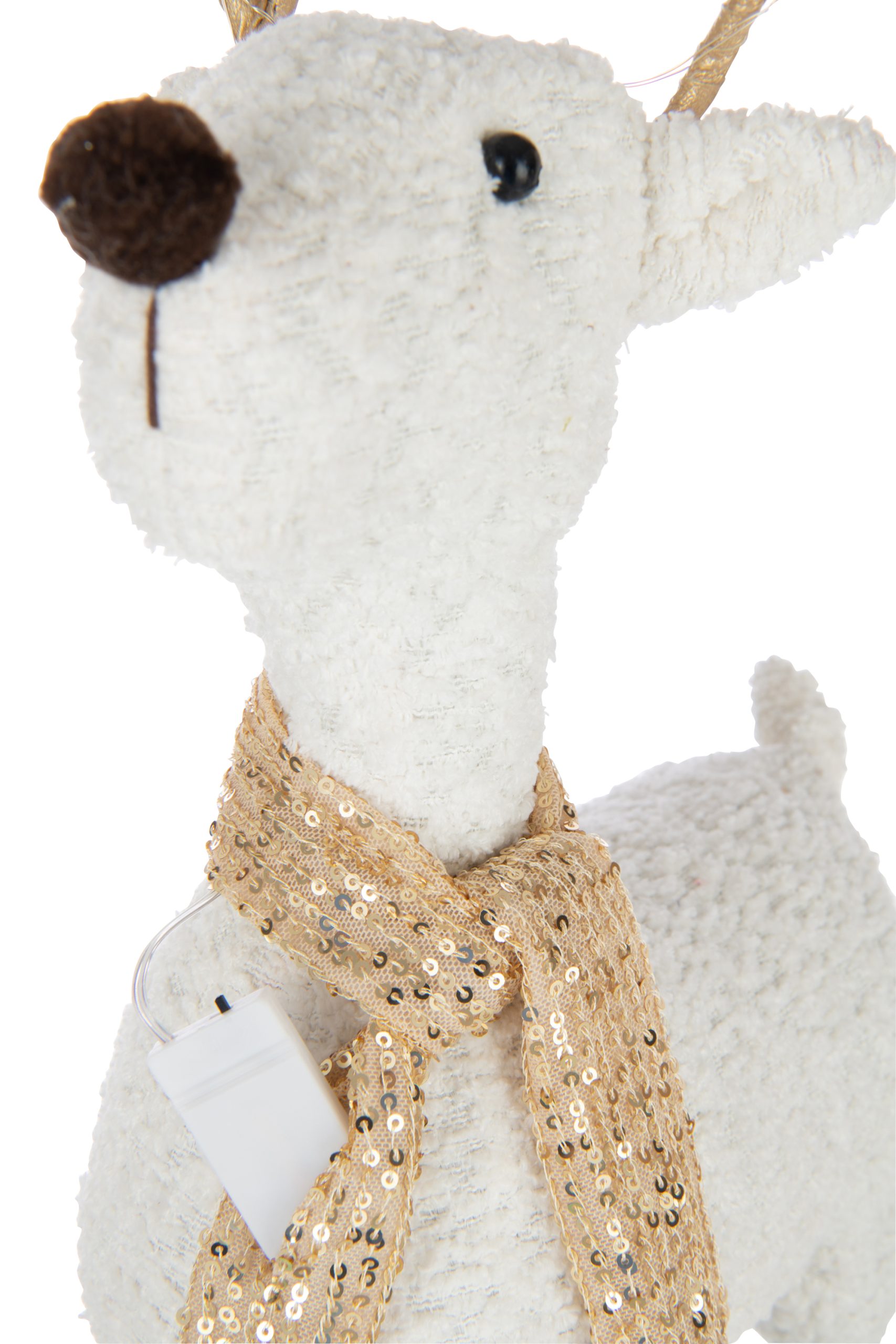 Estas renas brancas minimalistas destacam-se pelos detalhes dourados nas astes, patas e cachecol, criando uma decoração de Natal sofisticada e discreta. Com linhas simples e elegantes, acrescentam refinamento e charme a qualquer cenário natalício.